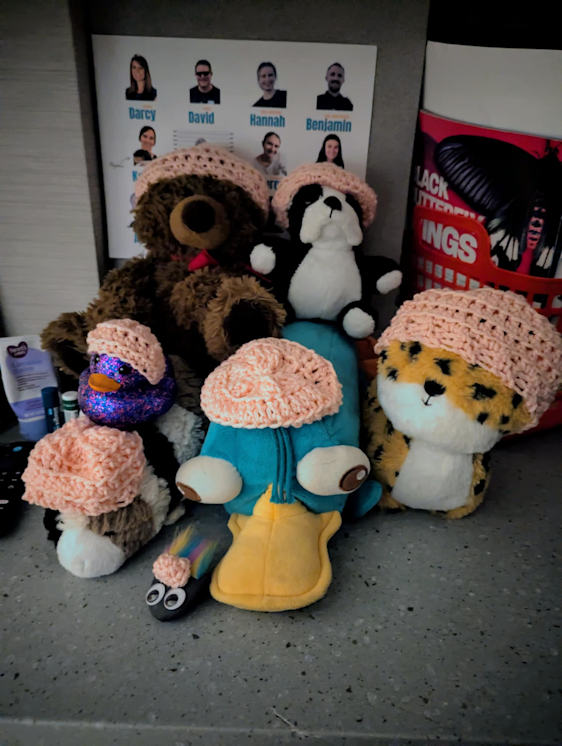 Saturday – This morning, we went to the T-rec room and made cinnamon rolls in the shape of an S (for Sethy, of course!) and made smoothies (Seth picked strawberry, banana & orange). Later, we painted on fabric where Seth drew shapes (heart, circle, smiley face) and painted his name (and drew masterpiece portraits of me and Ben) with a modified glove paintbrush. I also brought a skein of yarn to crochet a beanie for Seth (he picked the color). With half a skein left, I made matching hats for all of his stuffed animals which he and everyone got a laugh out of. It was also my first time spending the night in the room with Seth. I hadn’t been able to up until this point because I always had Annabelle with me (that’s right, she had a weekend with Dad this time! I missed her so much!) We both slept through the night fairly well and I can put it in writing that Seth says I don’t snore!